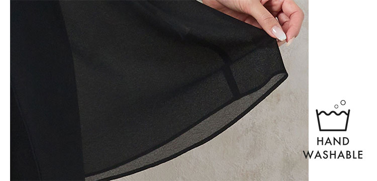 シャリみのある梨地ジョーゼットは薄手で細かいシボ感が特徴。涼やかな肌当たりと上品な透け感が美しい素材です。