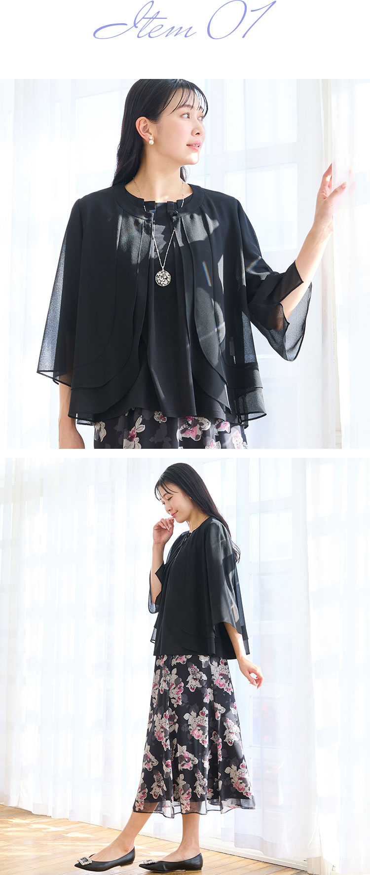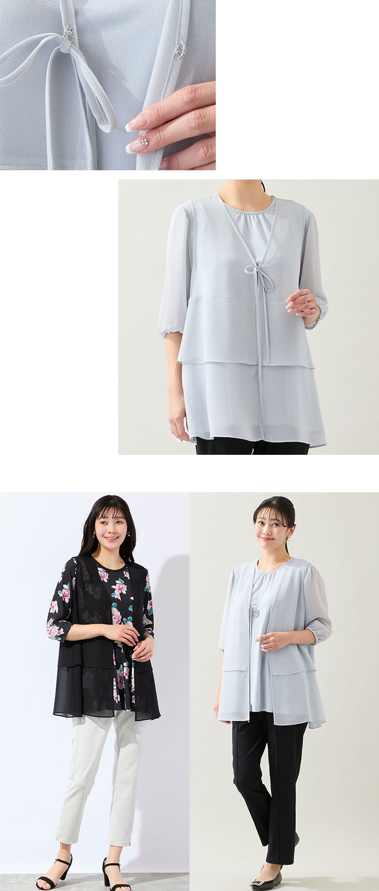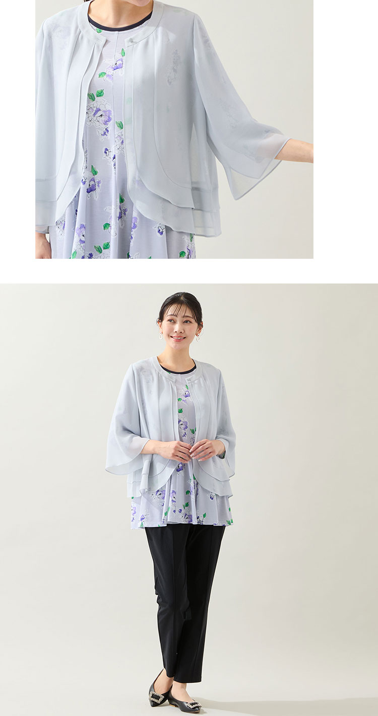 ワンボタンのボレロ風ブラウスは、ひらひらと揺れるティアードやフレアスリーブが女性らしいデザイン。軽快に羽織れ、エレガンススタイルに透明感を添えてくれます。