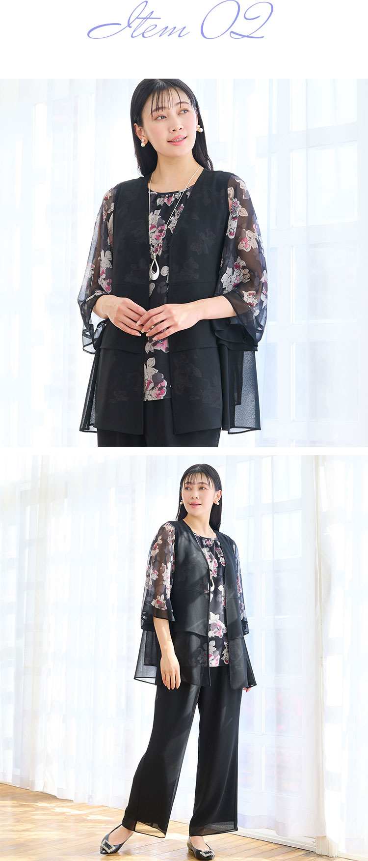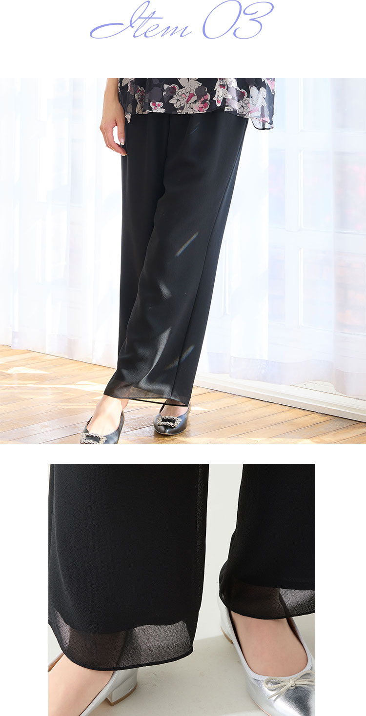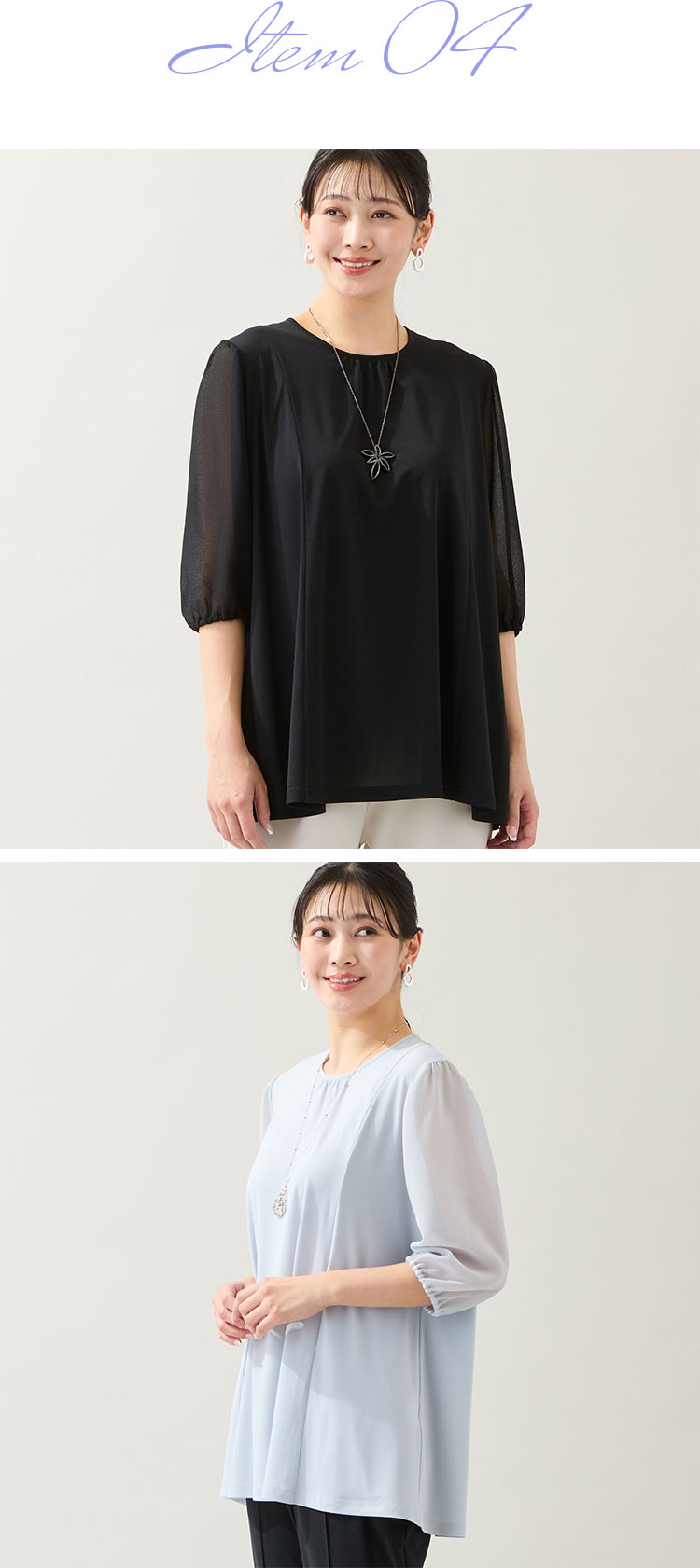 こちらは袖に梨地ジョーゼットを使用したトップス。身頃は伸縮性のあるニットジョーゼットを使用して着心地にこだわりました。
