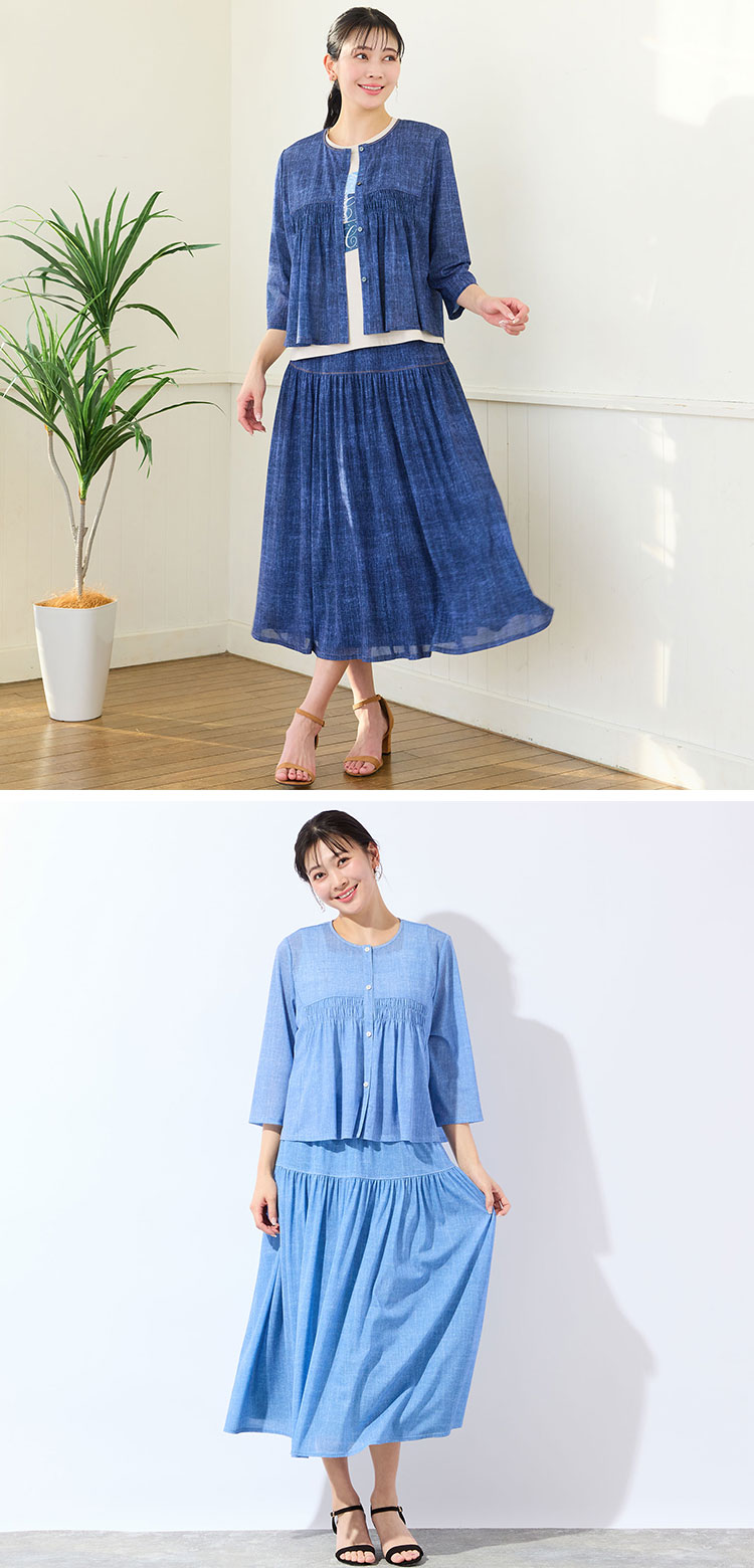 軽やかなチュールにデニム柄をのせたブラウス&スカートもオススメのアイテム。セットで着ればドラマティックな夏のお出かけコーデが完成します。