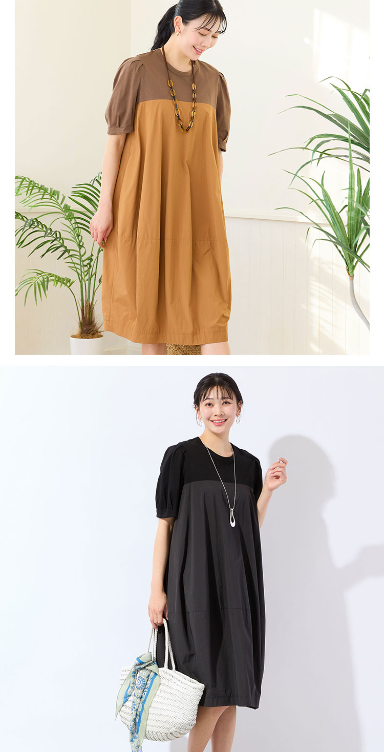 一枚で着てコーディネートが完成するワンピースは活躍間違いなし。素材のコントラストが効いたデザインで、今っぽいコクーンシルエットが新鮮です♪