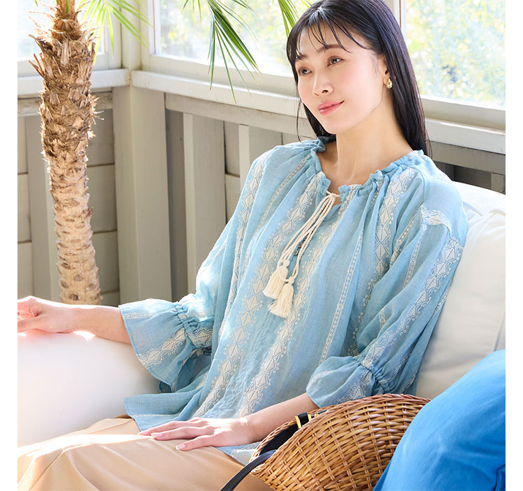 misselの夏のテーマ「BOHO CHIC」を体現したカフタンブラウスがこちら。一枚で、都会的に昇華したボヘミアンルックをお楽しみいただけます。