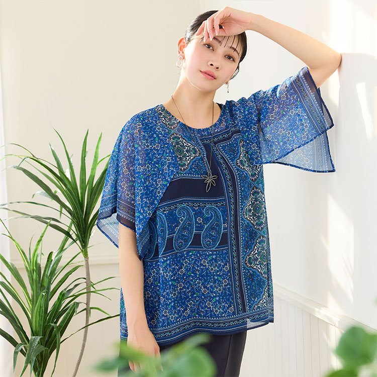 涼やかなペイズリー柄のブラウスは風通りのいいハンカチスリーブのデザイン。一枚でリッチに華やぐ夏にピッタリのアイテムです。