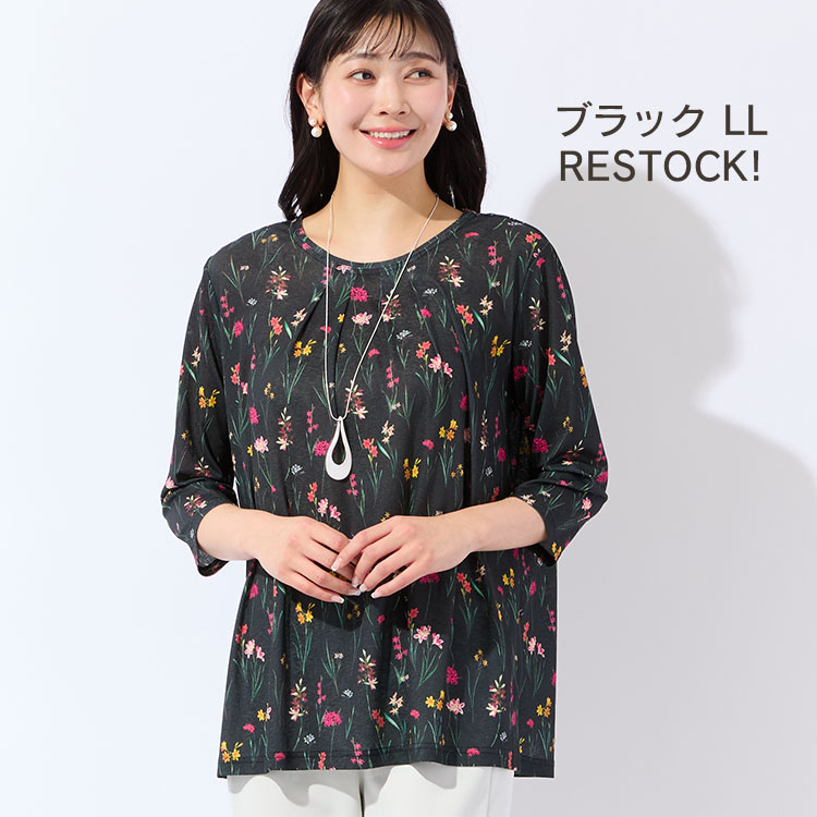 繊細なボタニカル柄が美しいカットソーは、薄手で涼やかな着用感が魅力。同柄のシャツとアンサンブルで着ても素敵です。