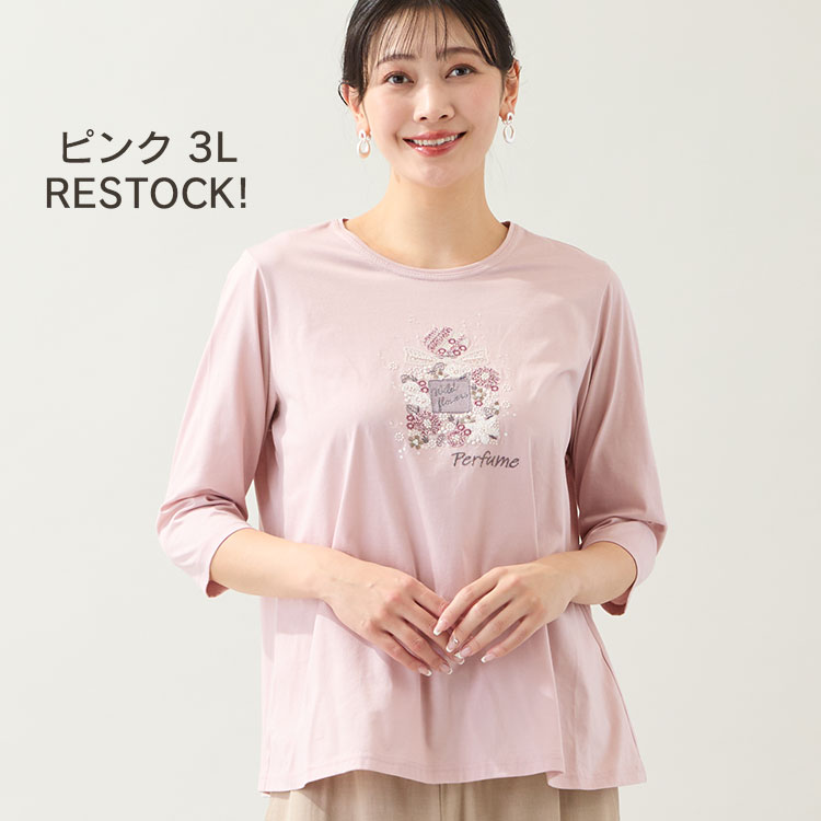 煌めく香水瓶の刺繍が入ったTシャツが人気急上昇!春に着たくなるピンクの3Lサイズが再入荷しました。