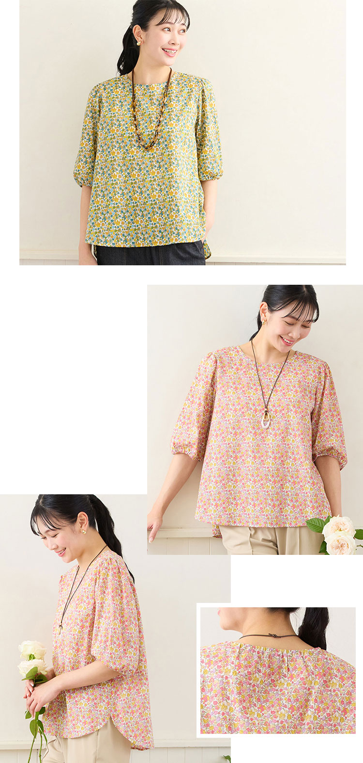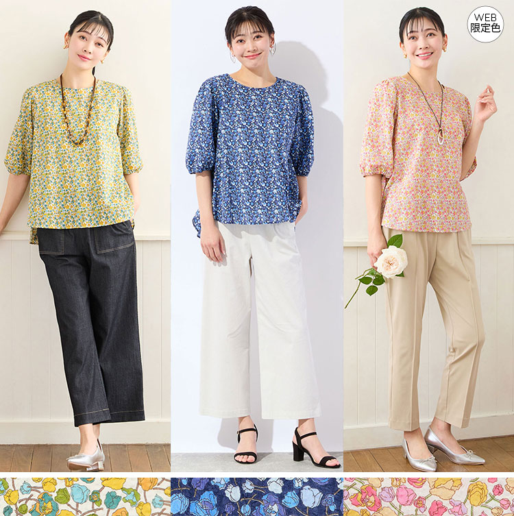 ふんわりとしたパフスリーブがおとな可愛いブラウス。着丈に前後差がありボトムを選ばないシルエットで着まわせます。