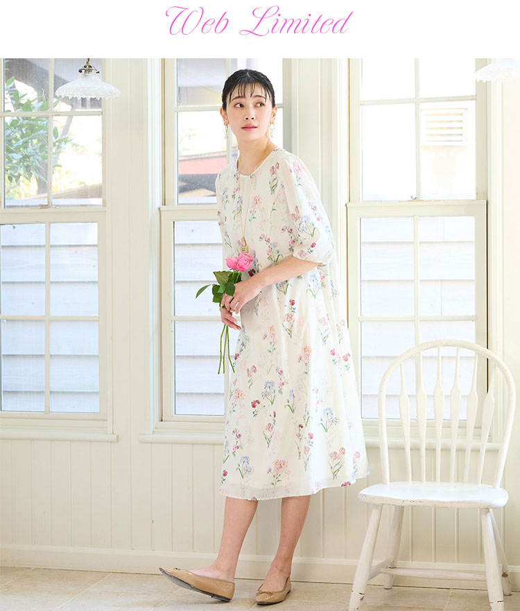 薄手のデシンにFlaneオリジナルのボタニカル柄をのせたワンピース。揺れ感が軽やかで、一枚で女性らしさが増すアイテムです。