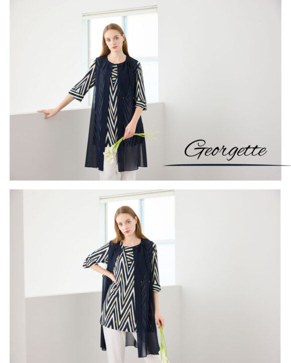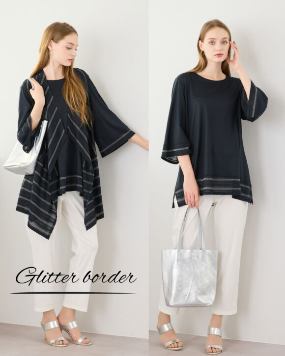 透け感のあるレーシーなボーダーにラメ糸を使用素材。リリアンビューティオリジナルのボーダー柄。ベスト・チュニックはアンサンブルで着用ができます。