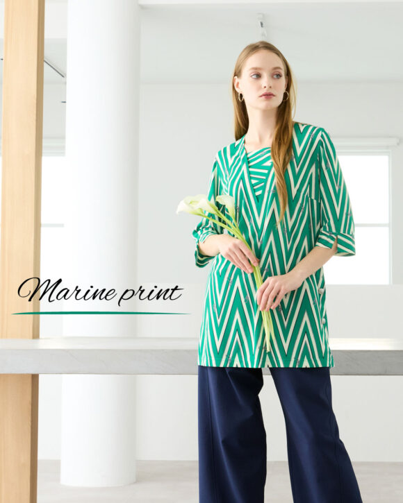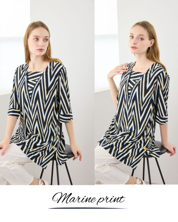 ジグザグのボーダーラインにロープの柄を効かせたお洒落なプリント。シンプルなトラッドマリンにちょっとひねりを効かせたジグザグラインやさりげないマリンのモチーフがかわいらしい。