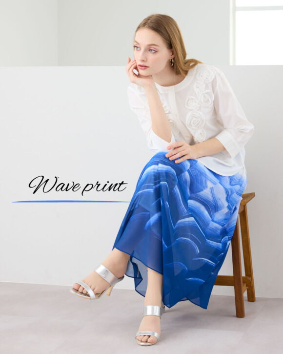 爽やかで印象的なプリントスカート。トップスはシンプルな無地ものを合わせるのがおすすめです。白を合わせればさわやかな印象に。