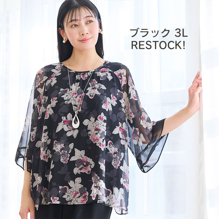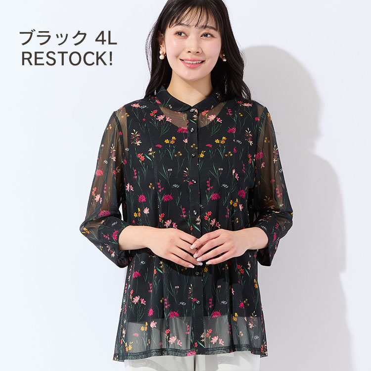 伸びがいいチュールのプリントシャツは毎年人気のアイテム。甘すぎないブラックの4Lサイズが数量限定で再入荷しております。オンラインショップ限定サイズですので、気になる方はお早めに☑