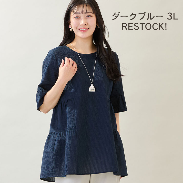 暑い季節も涼やかに着られるコットンチュニックは、可愛さと体型カバーを両立できる頼れるアイテム。人気のダークブルーの3Lが再入荷しました。オンラインショップ限定サイズですので、気になる方は要チェック!