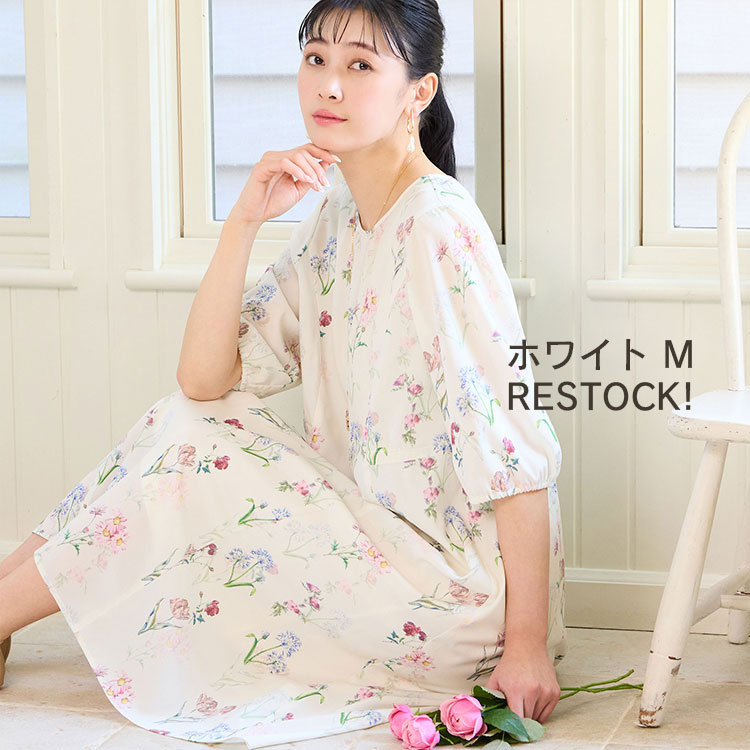 可憐なボタニカル柄のワンピースは、ホワイトのMサイズが数量限定で再入荷!オンラインショップでしか手に入らない限定カラーです♡