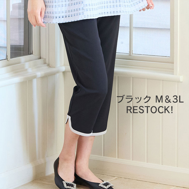 裾のパイピングが効いたクロップドパンツはブラックが大人気。接触冷感性と吸水速乾性があり暑い季節も快適に楽しめるパンツです。