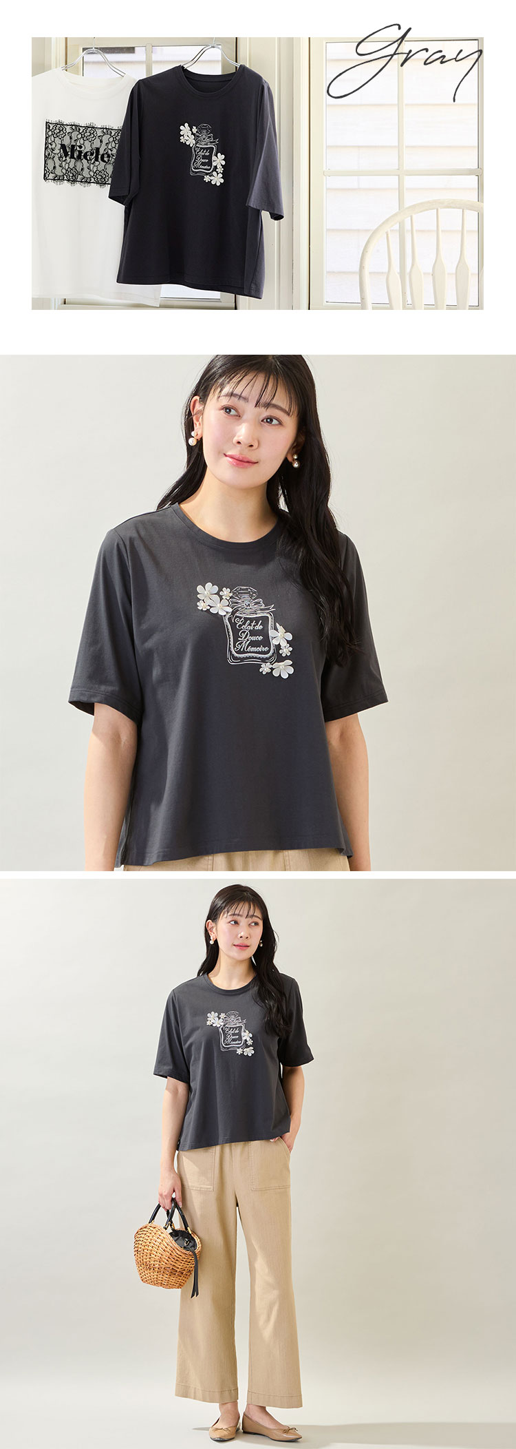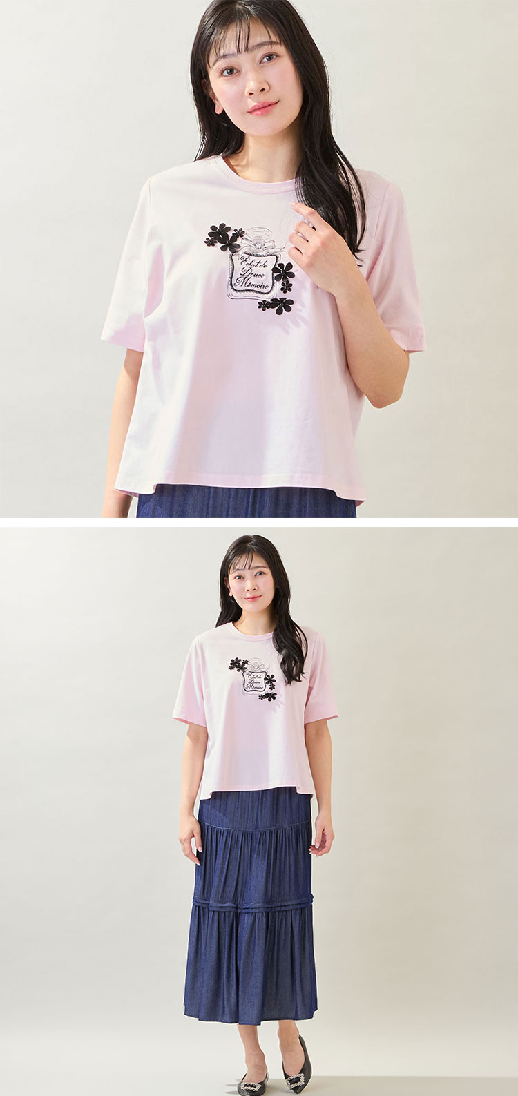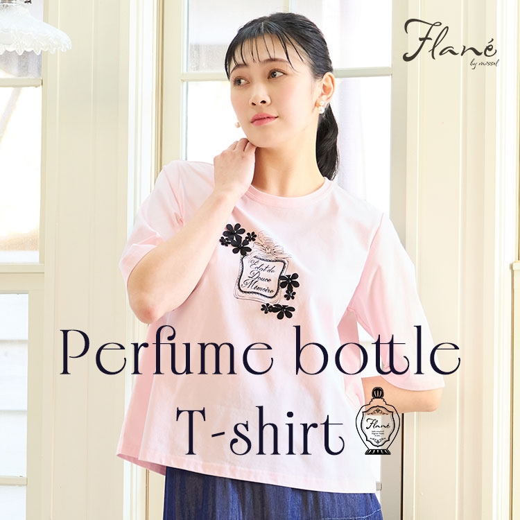 胸元に香水瓶をプリントしたTシャツ。香水瓶のまわりには立体的なお花のモチーフを散りばめたおとな可愛いデザインです♡