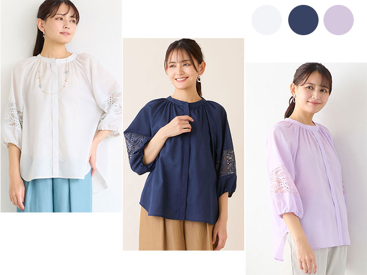 柔らかく、ほんのりと透け感のあるローンのブラウス。レースを接ぎ合せたボリューム感たっぷりのお袖が可愛らしいデザインです。