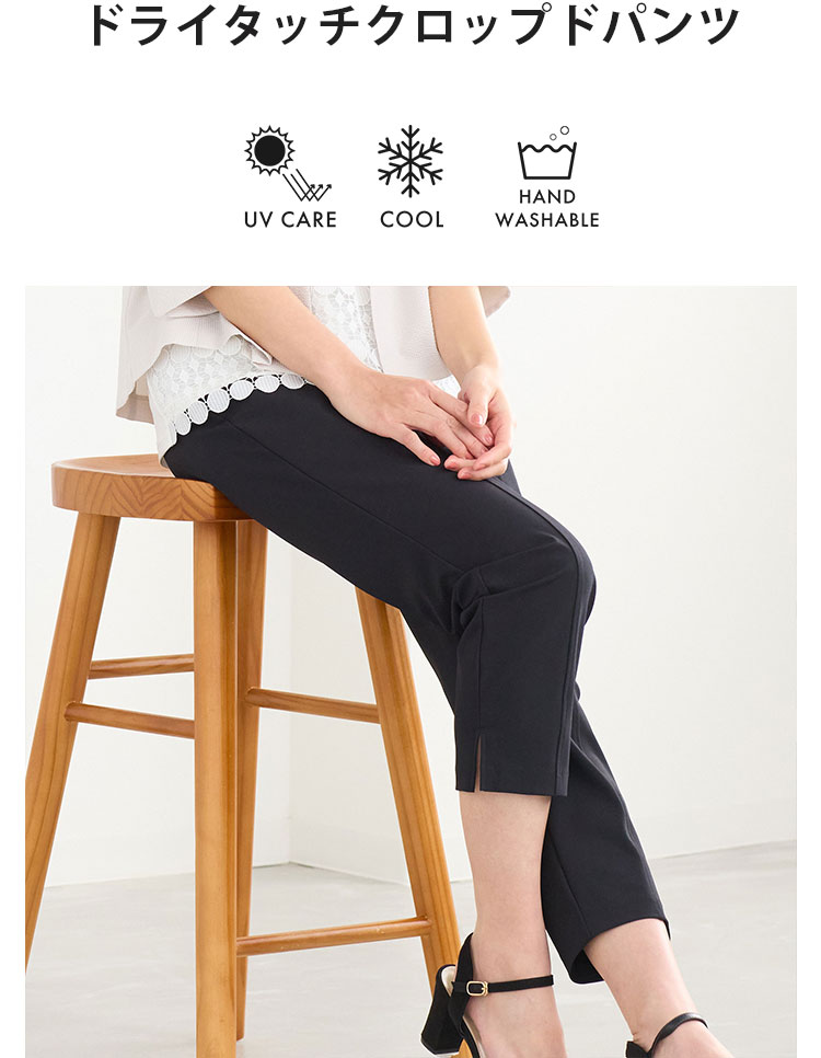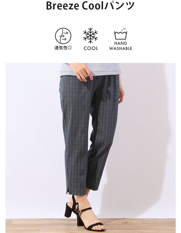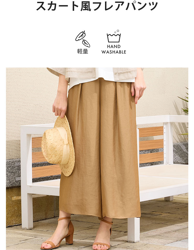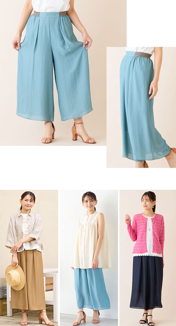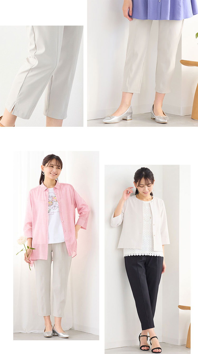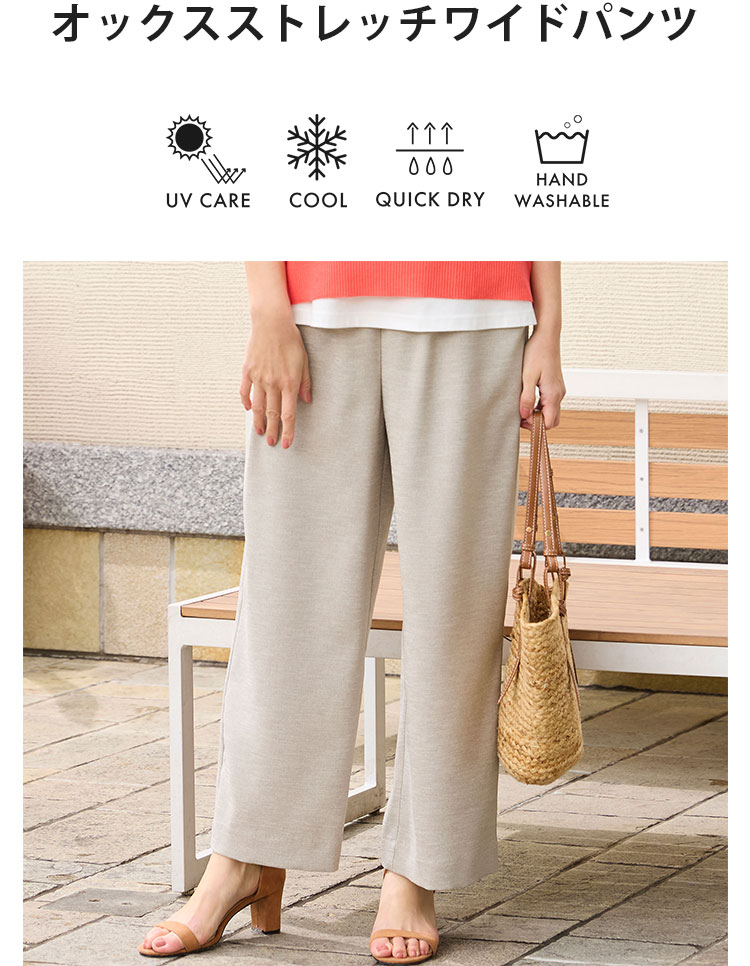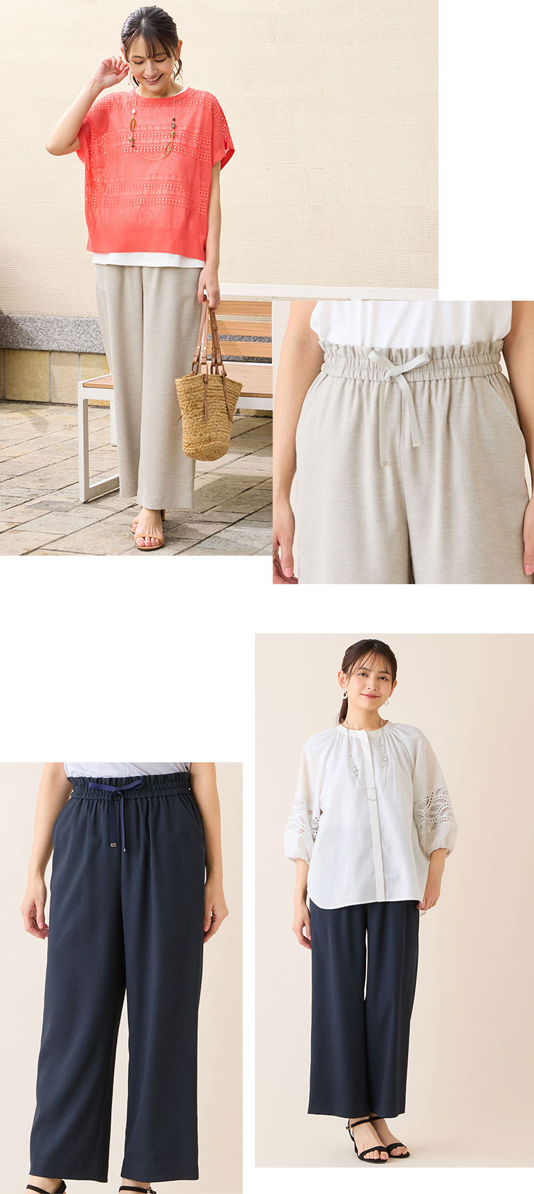 UVカット・接触冷感・吸水速乾などの多機能をもつ快適素材のイージーボトム。麻のようなナチュラルな表情がありながら、手洗い可能でシワになりにくいのが魅力です。