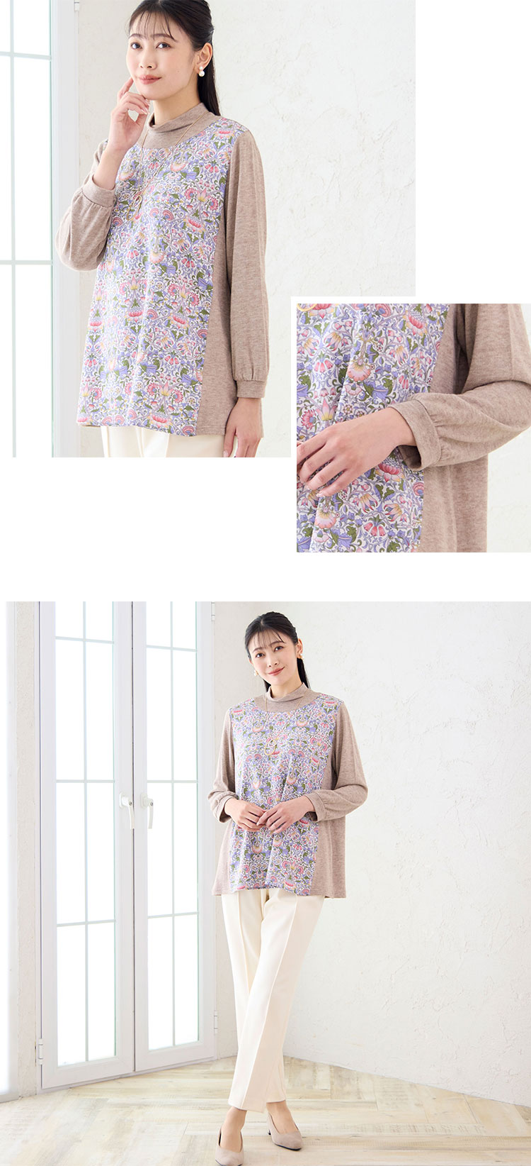 繊細なタッチで描かれた植物柄をジョーゼットにプリントしたカットソー。無地部分は柔らかく伸縮性の高いニット素材を使用し着心地にもこだわりました。パフスリーブが手元を女性らしく演出してくれますね。