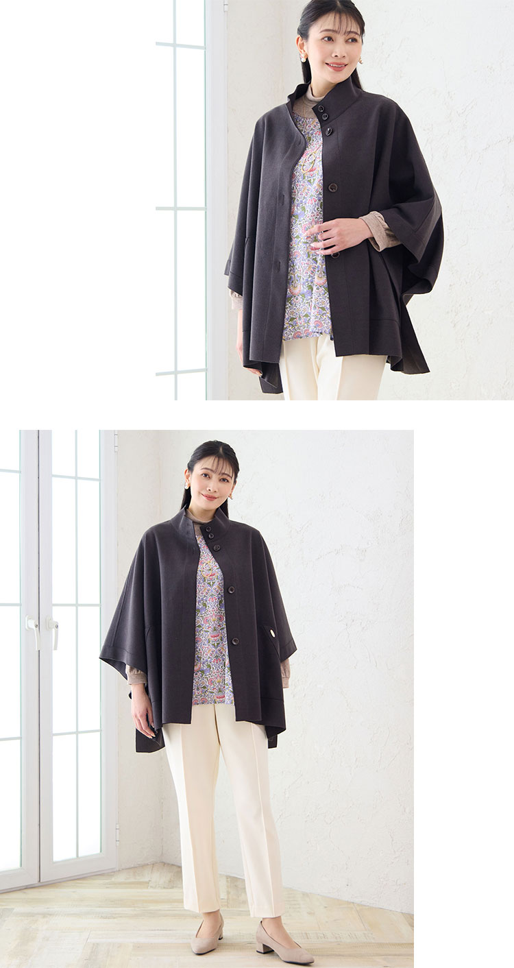 アウターとのコーディネートも楽しめます。人気のケープジャケットを羽織ればこなれ感たっぷりのスタイルに。
